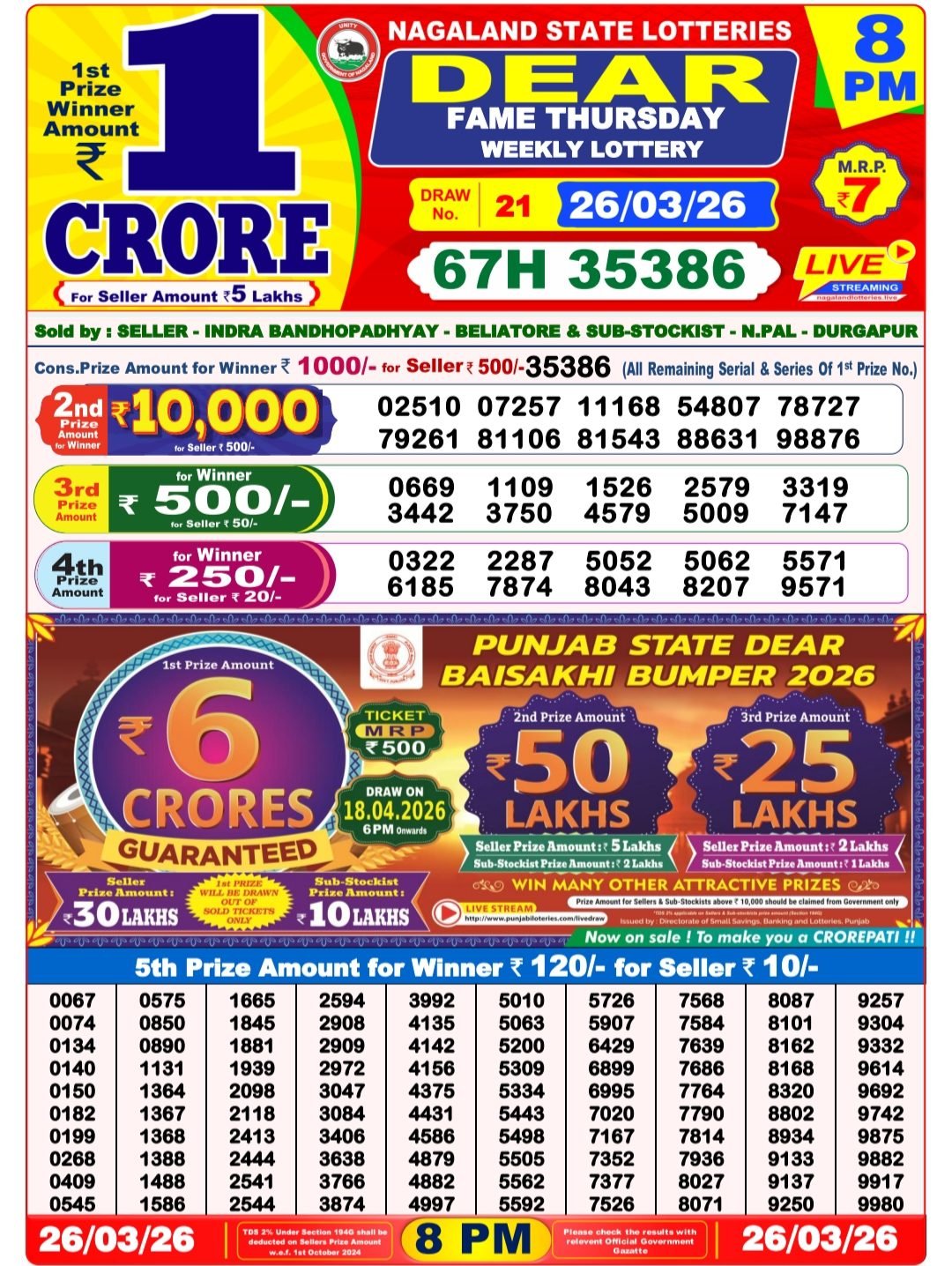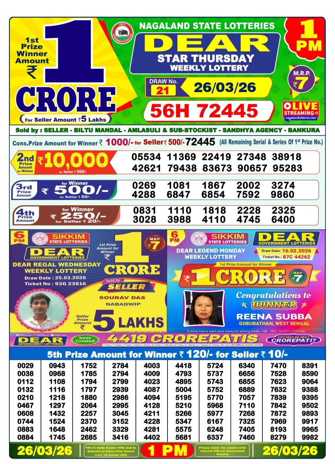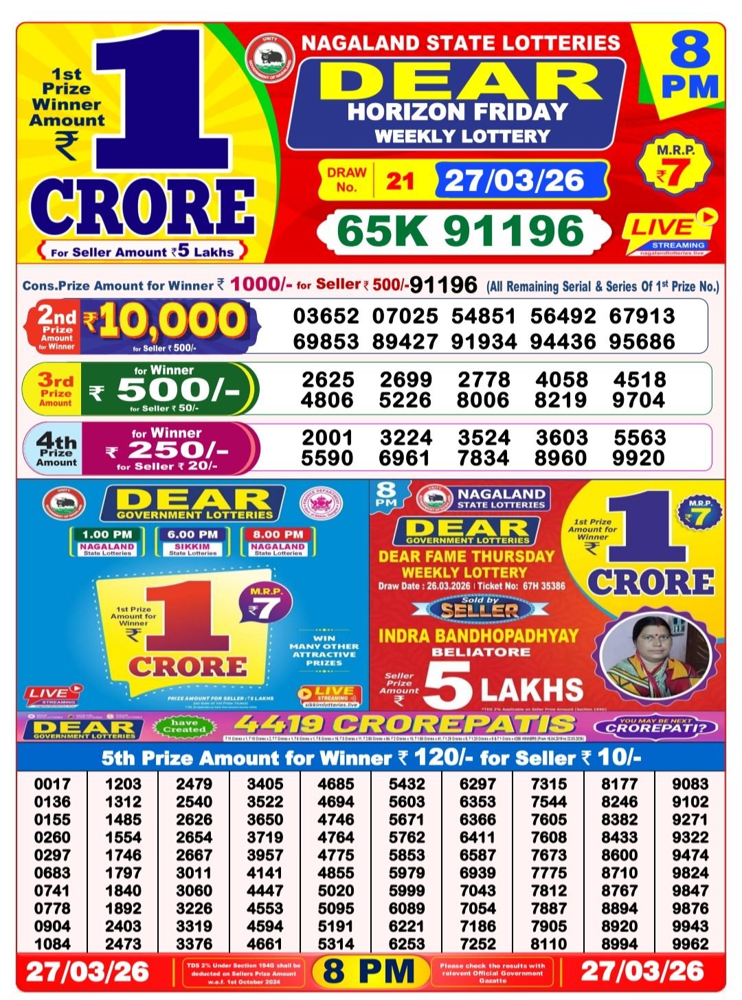 - Nagaland State Lotteries – Dear Seagull Friday Weekly Lottery Results – 8 PM