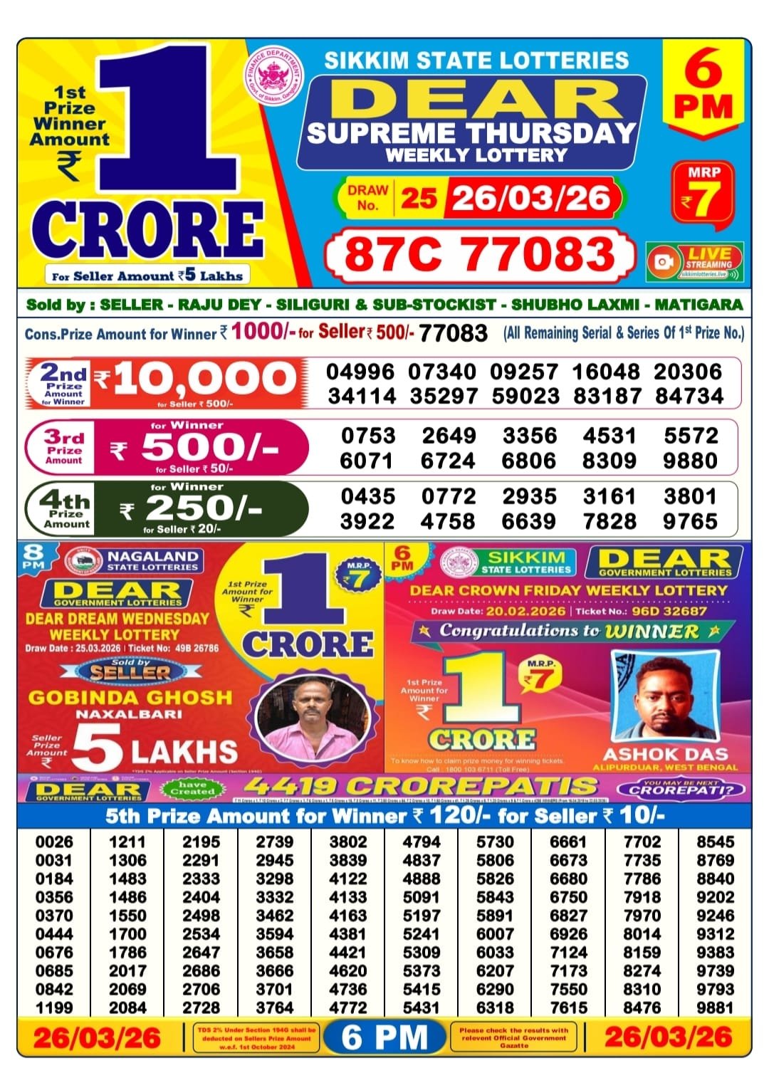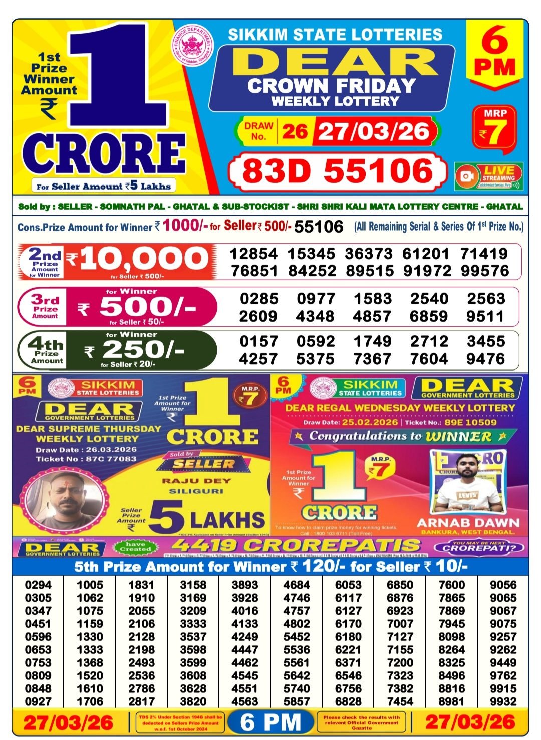 - Sikkim State Lotteries – Dear Crown Friday Weekly Lottery Results – 6 PM
