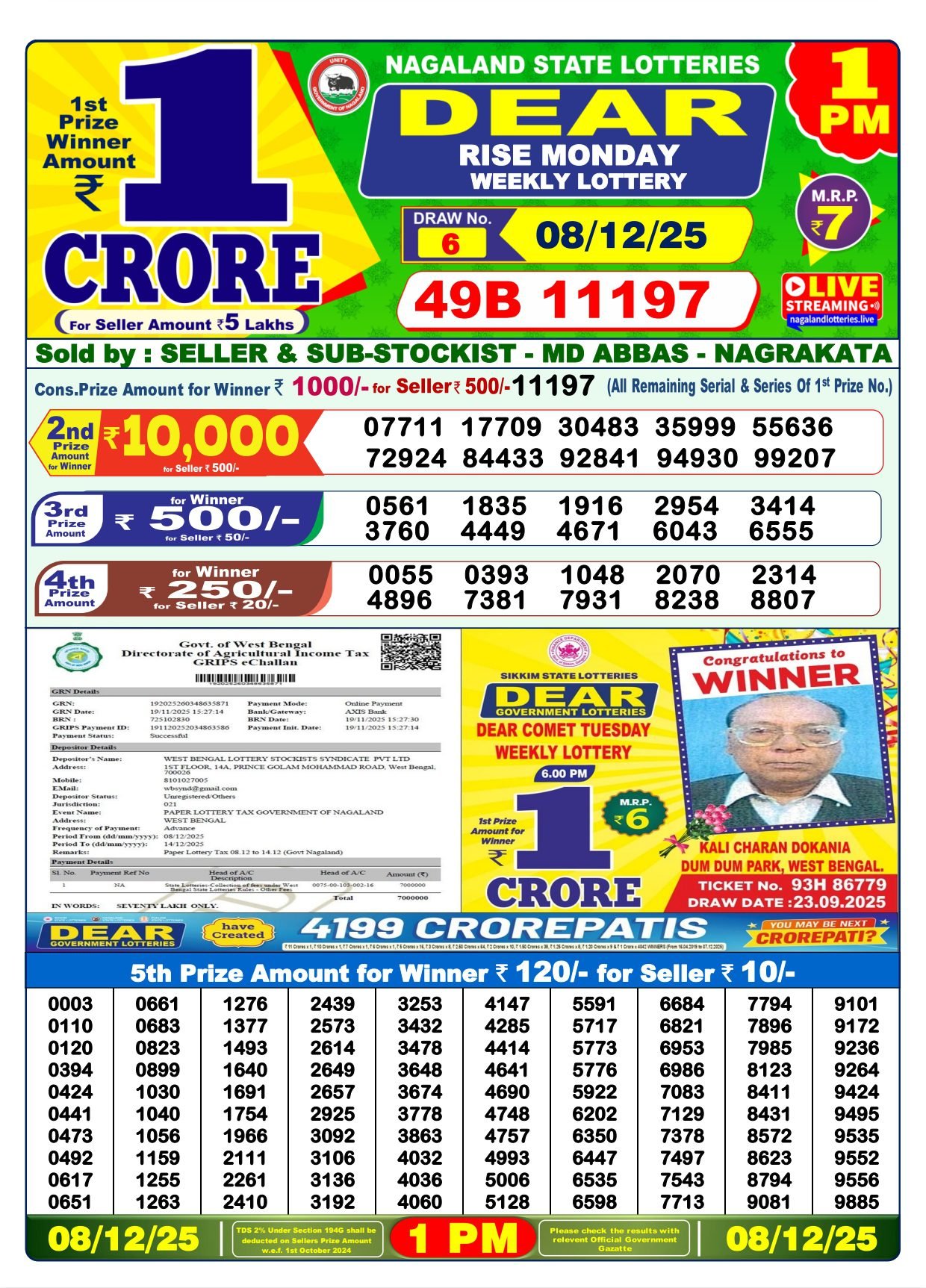 Nagaland State Lotteries – Dear Dwarka Monday Weekly Lottery Results – 1PM