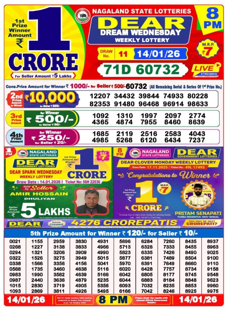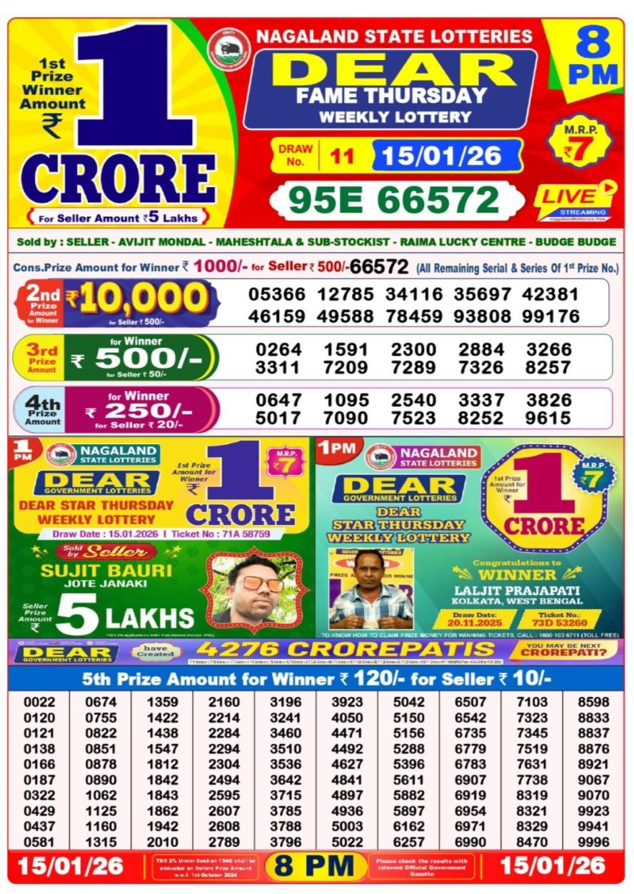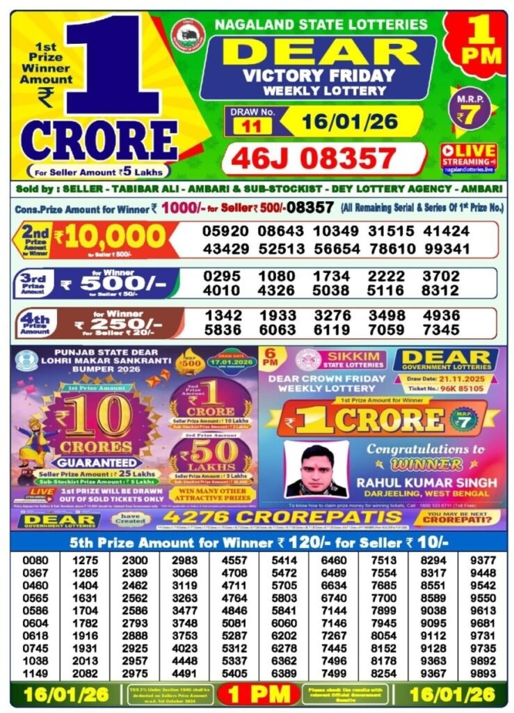 The Nagaland State Lottery is held daily at P. R. Hill Junction, Kohima – 797001, and is officially managed by the Director of Nagaland State Lotteries. It offers multiple draws like Dear Morning, Dear Day, and Dear Evening, attracting thousands of participants with exciting cash prizes.