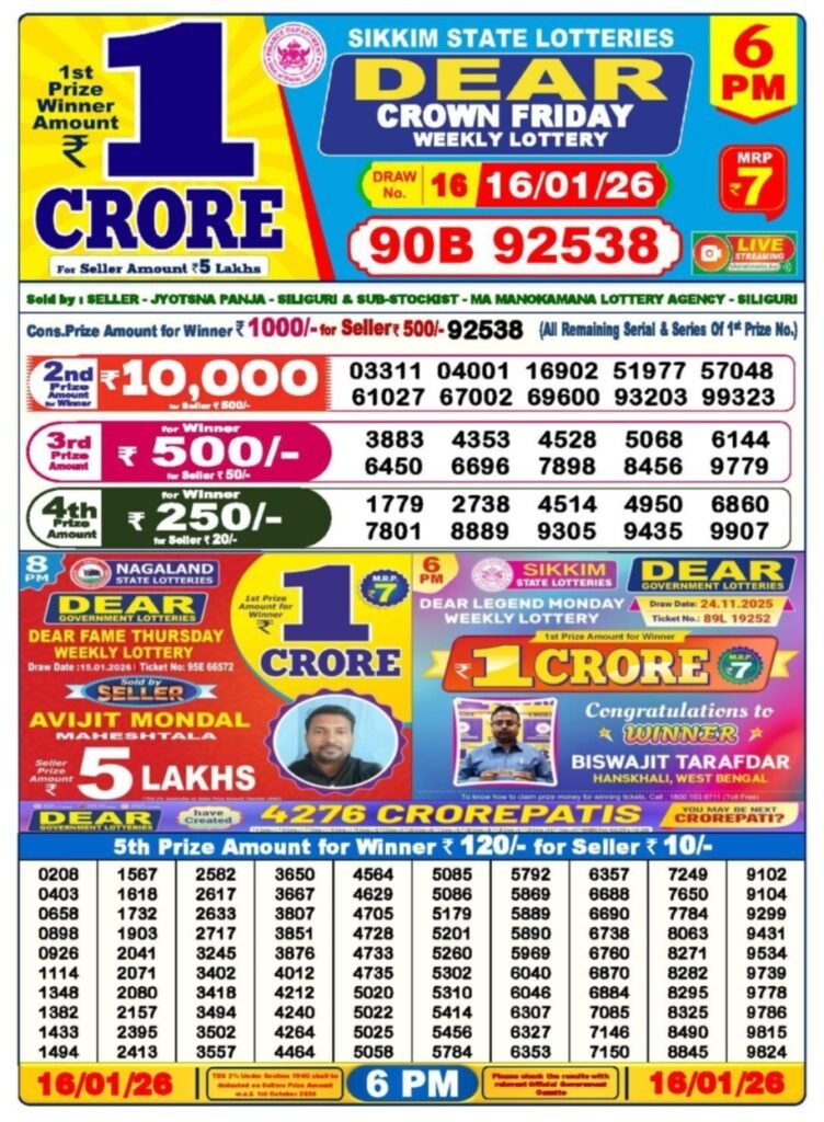 Sikkim State Lotteries – Dear Crown Friday Weekly Lottery Result (16 January 2026)