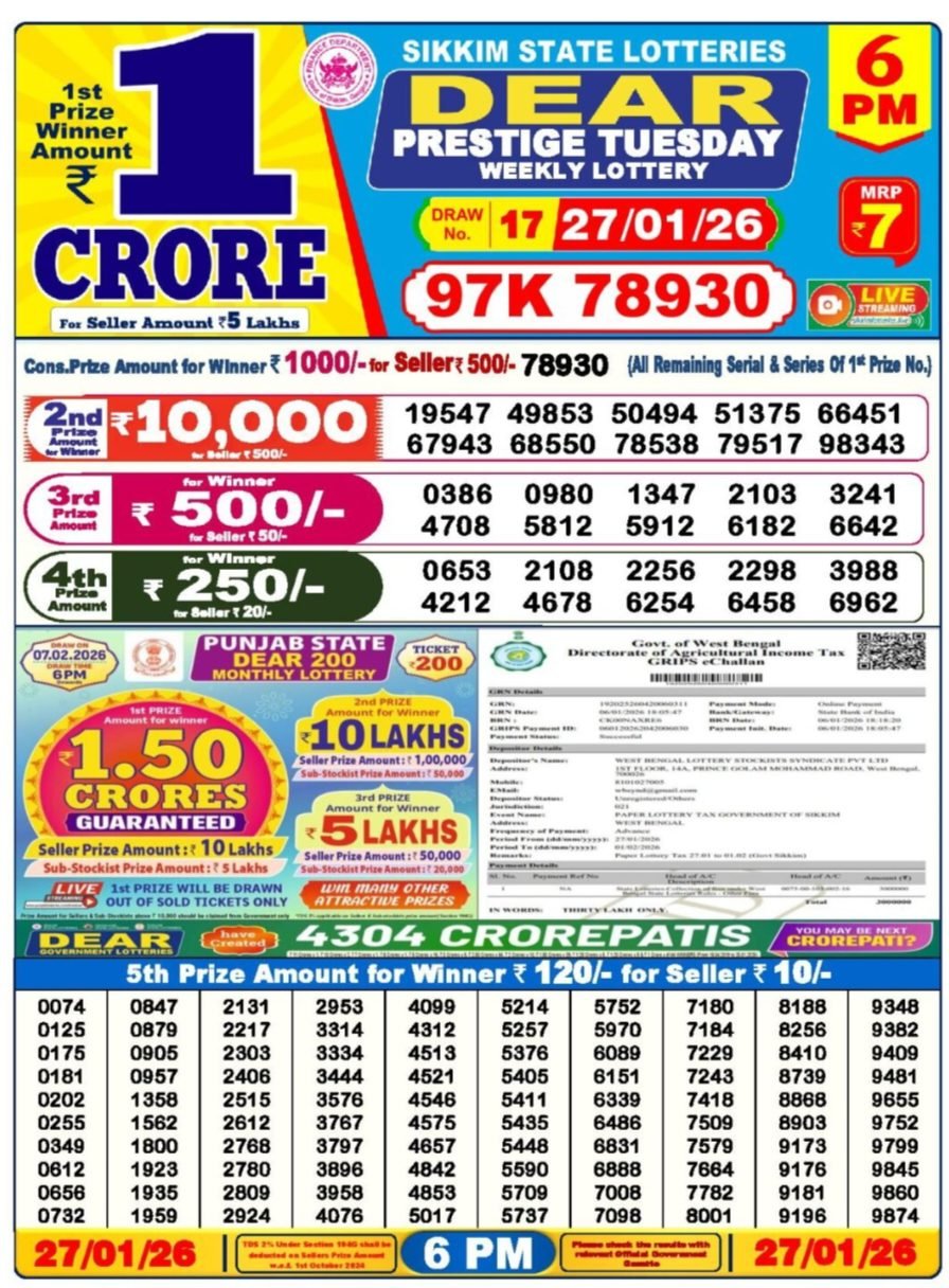 - Sikkim State Lotteries – Dear Prestige Tuesday Weekly Lottery Results – 6 PM