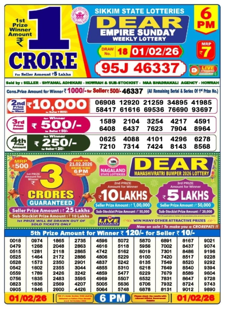 The official winning number for the 1st Prize of ₹1 Crore is 95J 46337 (series 95J, number 46337). This matches the prominently featured ticket on your shared lottery poster from seller Shyamal Adhikari (Howrah) via Maa Bhadrakali Agency.