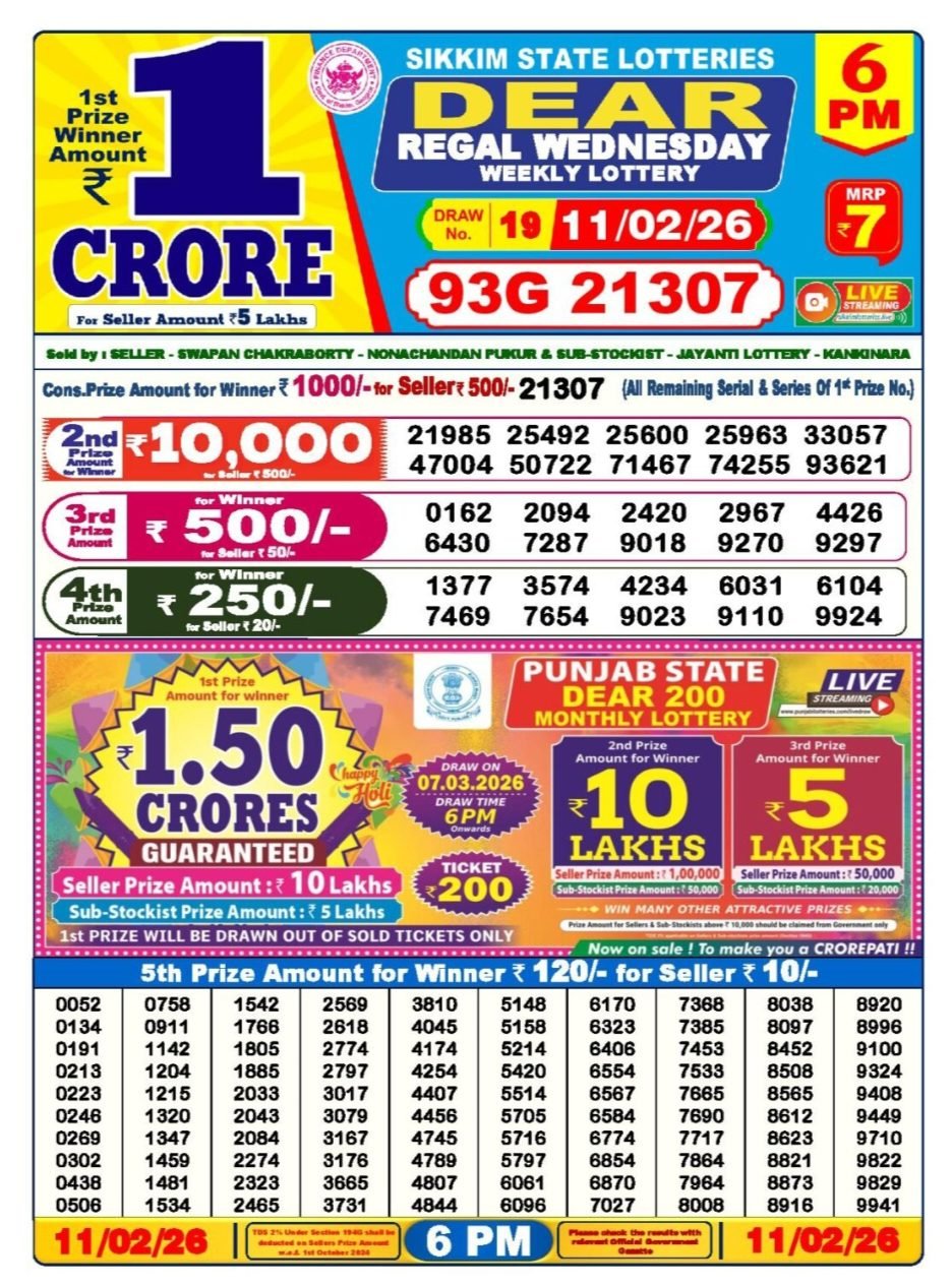 - Sikkim State Lotteries – Dear Regal Wednesday Weekly Lottery Results – 6 PM