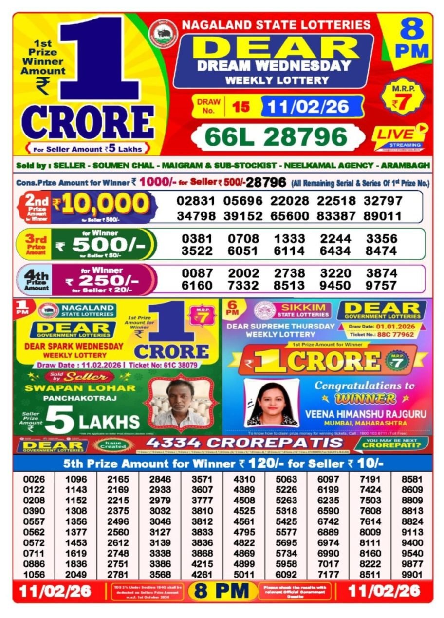 Nagaland Dear Lottery Sambad Result Today is updated live on this page for all three daily draws – 1 PM (Dear Morning), 6 PM (Dear Day), and 8 PM (Dear Evening/Night). Check the winning numbers, prize details, draw names, Yesterday’s Dear Lottery (ডিয়ার লটারি) results, and the full weekly timetable.