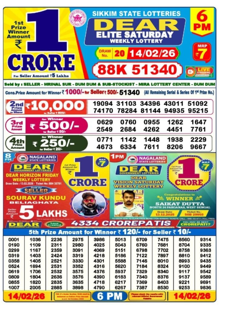 Dear lottery – Sikkim State Lotteries Dear Elite Saturday Weekly Lottery, draw date 14/02/2026 (February 14, 2026), draw no. 20, at 6 PM.