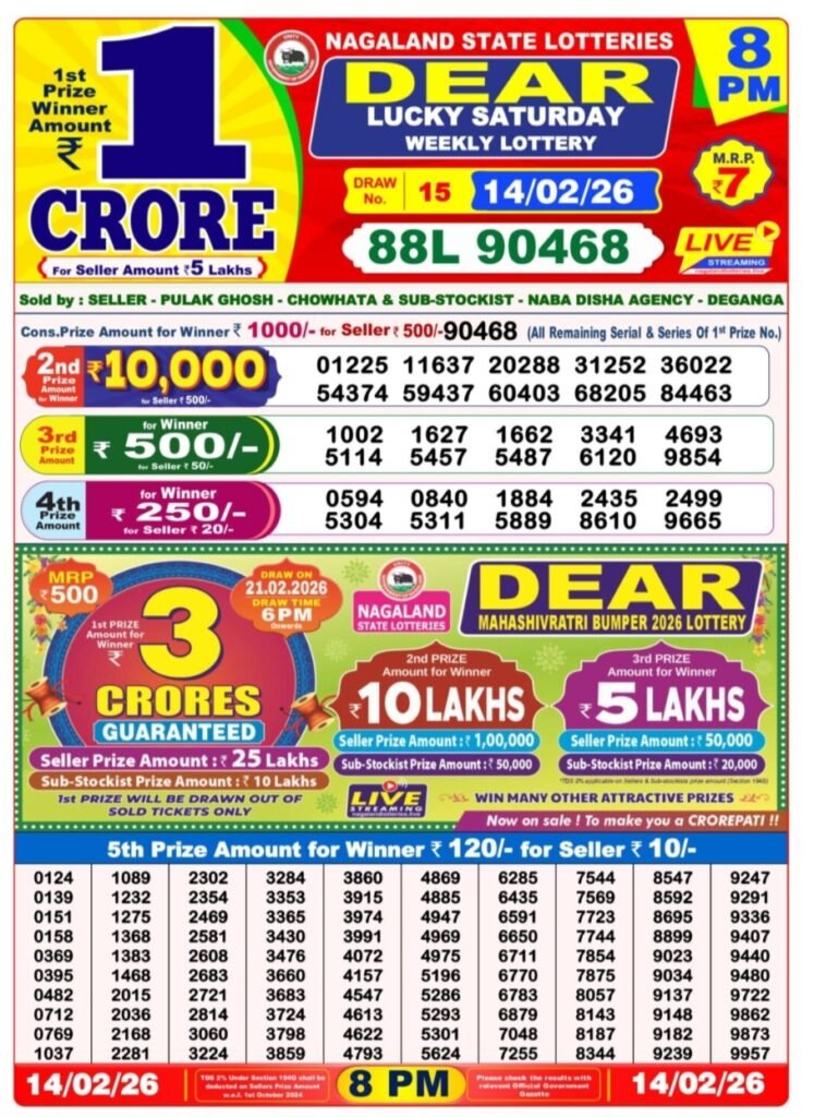 Dear lottery – Nagaland State Lotteries Dear Lucky Saturday Weekly Lottery, Draw No. 15, scheduled for February 14, 2026 (14/02/2026) at 8 PM.