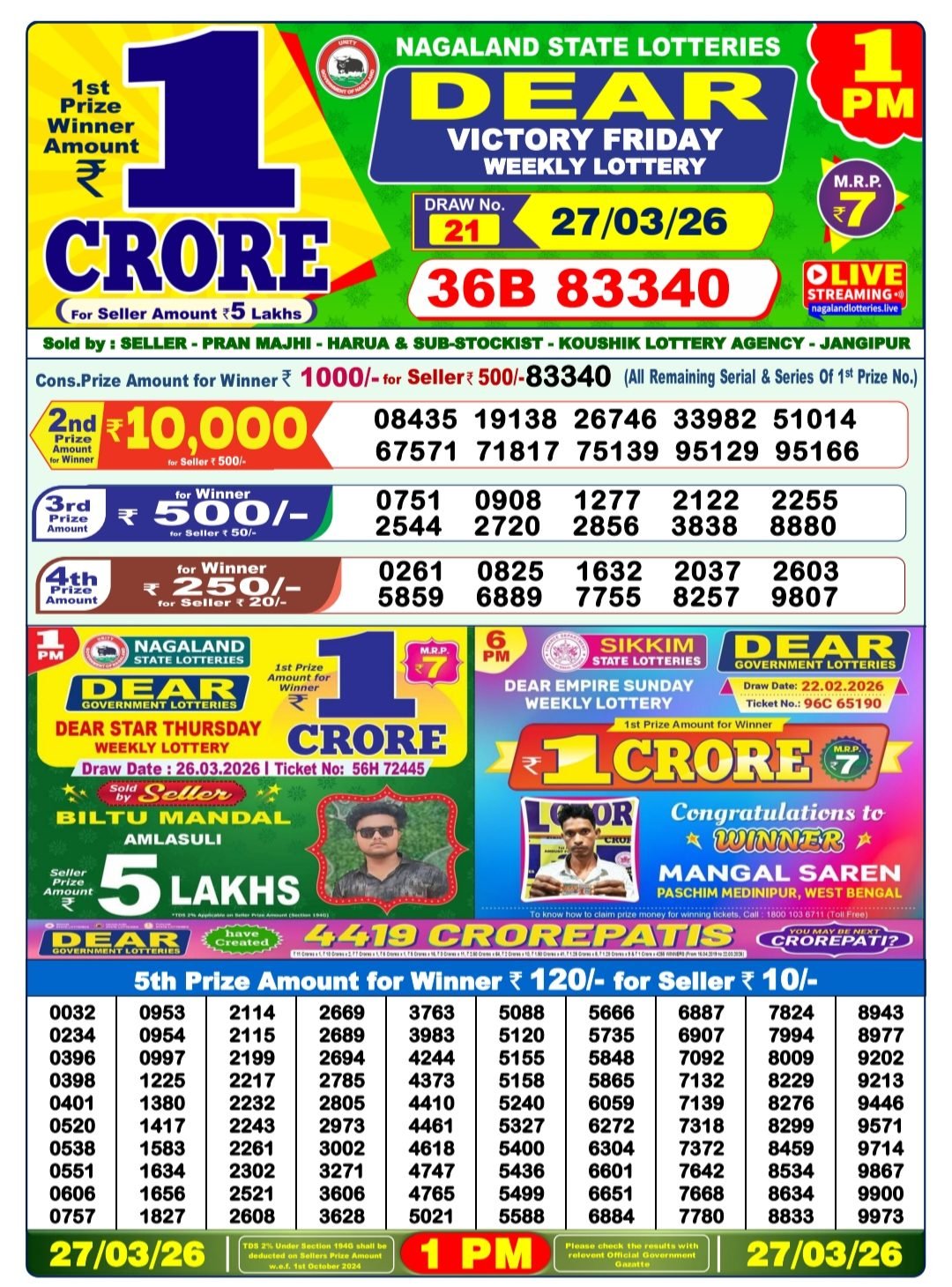 Consolation Prize: ₹1000 for winners | ₹500 for sellers (All remaining serials of the 1st prize number)