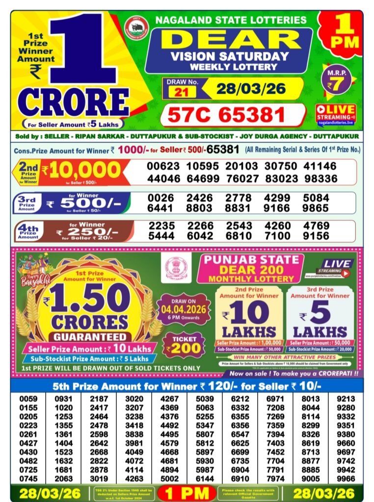 Here is the complete result of the Nagaland State Lotteries Dear Vision Saturday Weekly Lottery draw held on 28/03/2026 at 1 PM.