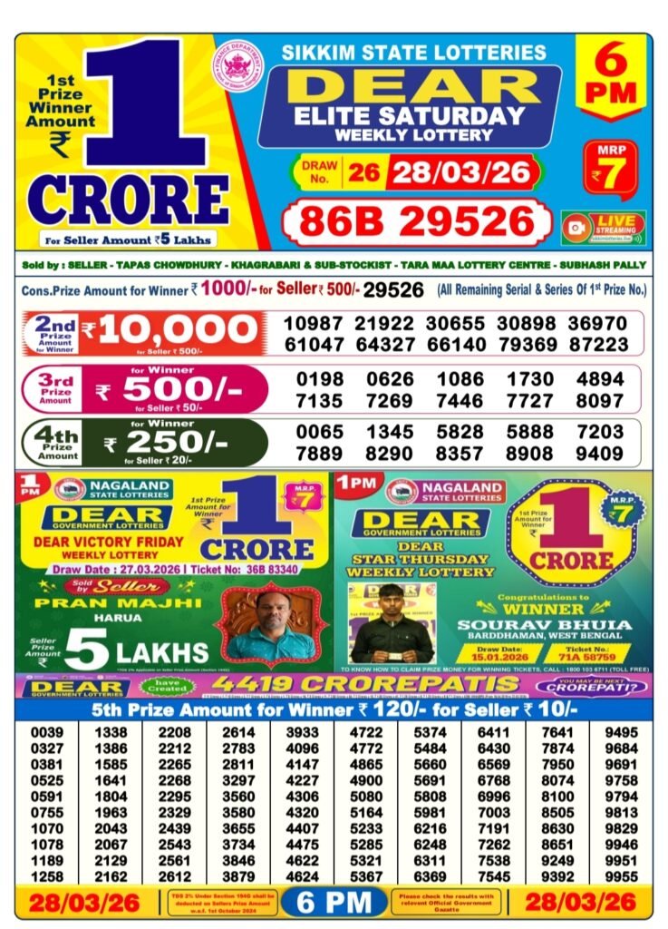 Lottery Sambad Today 28 March 2026 Result for Sikkim State Lottery – Dear Elite Saturday Weekly Lottery Result – 28-03-2026 – 6 PM Draw.