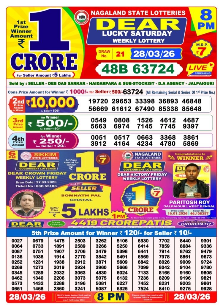 The Dear Lucky Saturday Weekly Lottery, organized by Nagaland State Lotteries, was held on 28/03/2026 at 8 PM. This popular weekly draw offers exciting prize opportunities, including a bumper first prize of ₹1 Crore. Below are the complete results with all winning numbers and prize details.