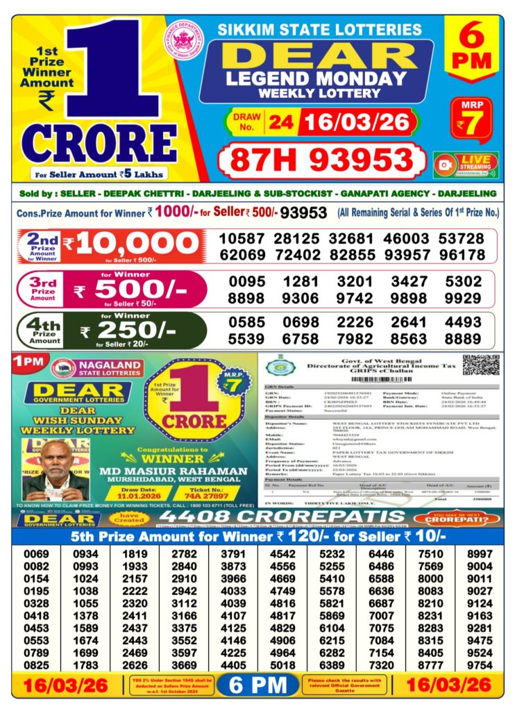 - Sikkim State Lotteries – Dear Legend Monday Weekly Lottery Results – 6 PM