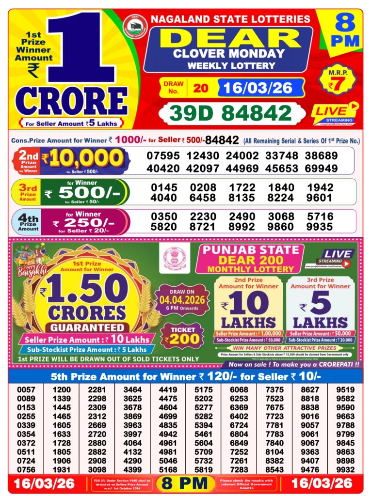 The Dear Clover Monday Weekly Lottery organized by the Nagaland State Lotteries was successfully drawn on 09/03/2026 at 8 PM. Thousands of participants eagerly wait for this result every week because of the attractive prize structure and affordable ticket price. The ticket MRP is ₹7, and the lottery offers multiple prize categories, including the grand 1 Crore first prize.