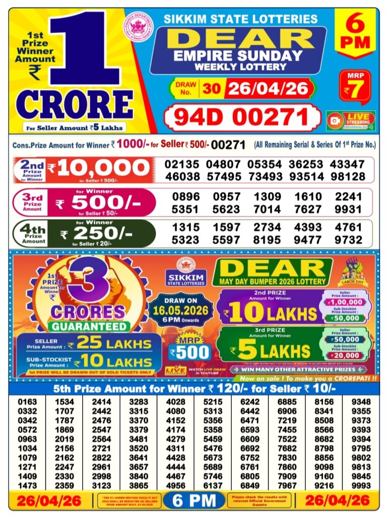 Lottery Sambad Today 26 April 2026 Result for Sikkim State Lottery – Dear Empire Sunday Weekly Lottery Result – 26-04-2026 – 6 PM Draw.