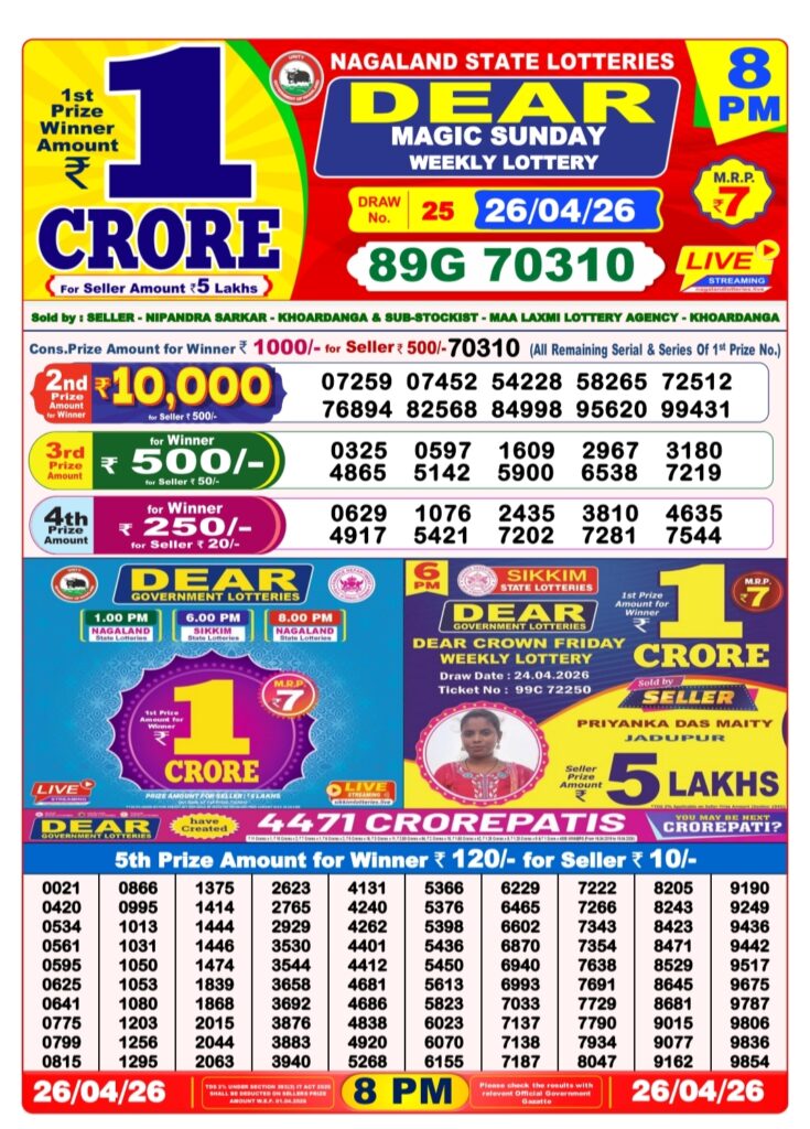 Dear Lottery Result Today 26-04-2026 | Nagaland State Lottery Sambad 1pm, 6pm, 8pm Results