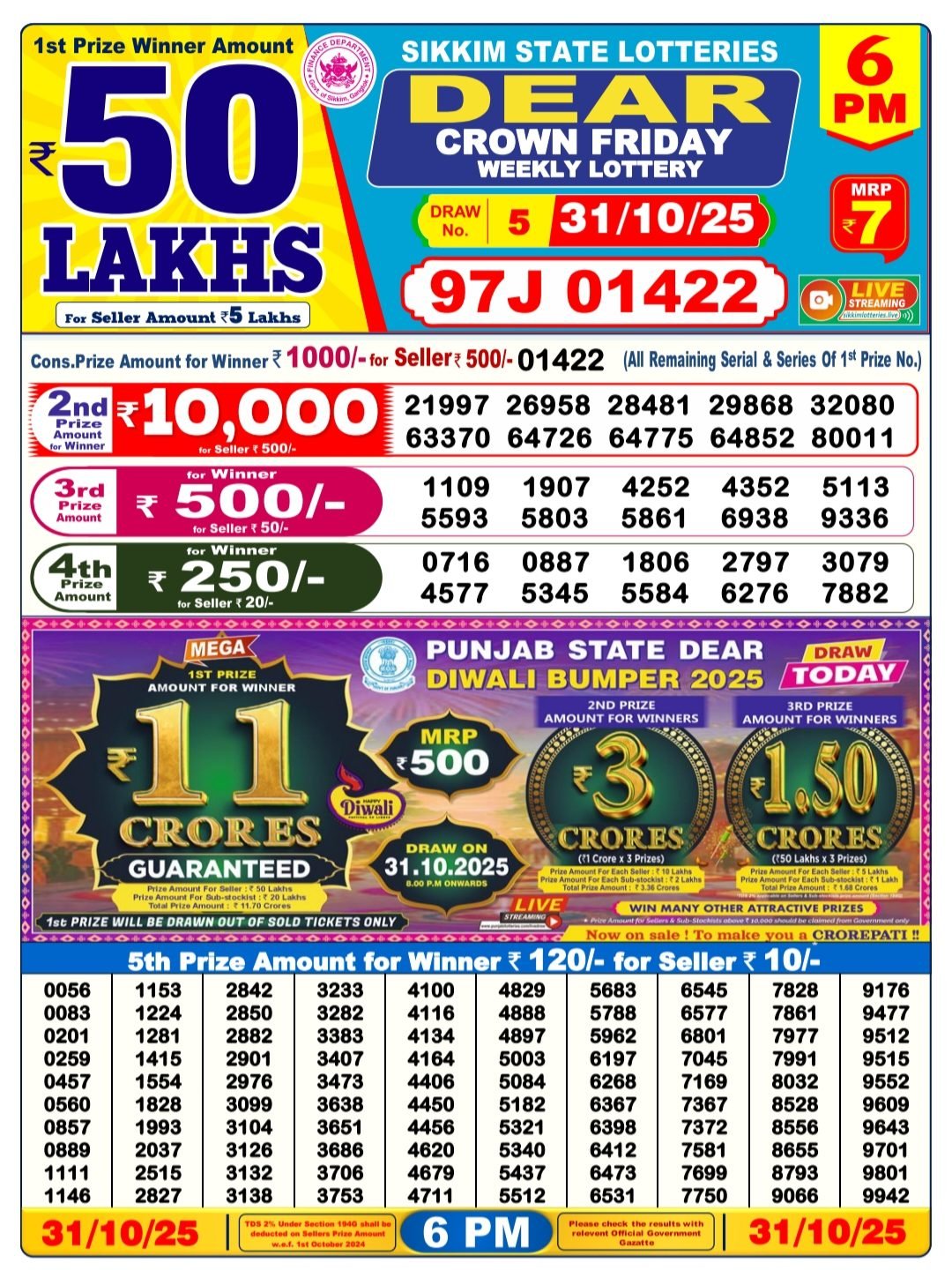 Both the Nagaland and Sikkim State Lotteries conduct three draws daily – Morning at 1PM, Evening at 6PM, and Night at 8PM. The ticket price is only ₹6, while the top prize is ₹1 crore. These government-run lotteries are completely legal and transparent, making them trusted by millions of participants across India.